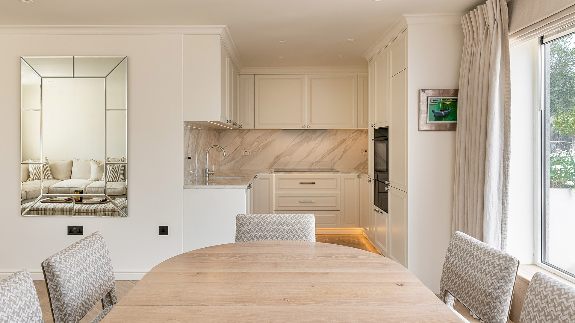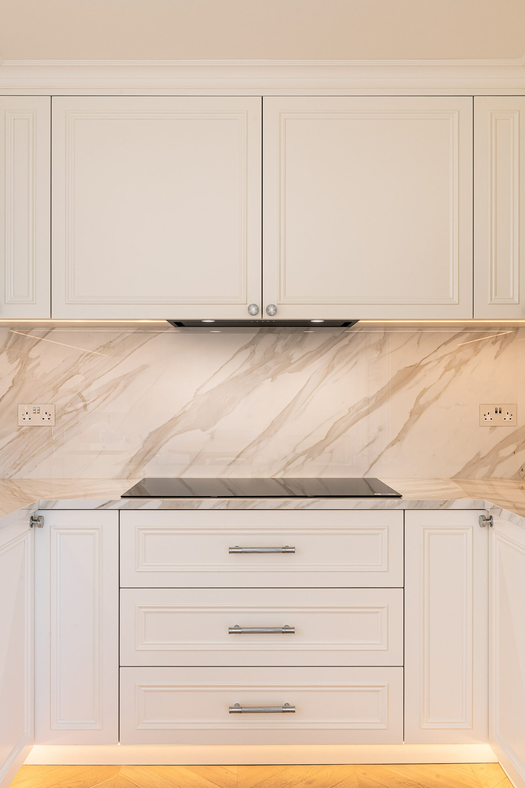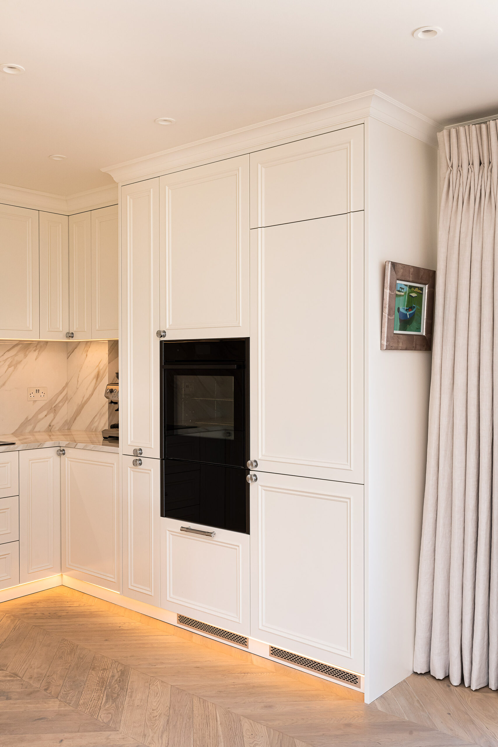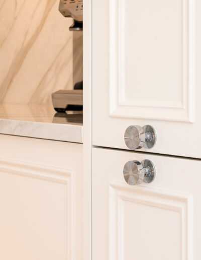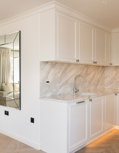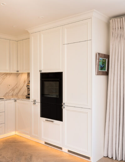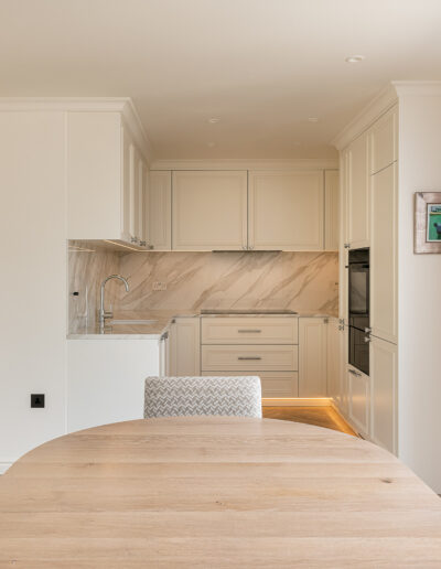 Our joinery was designed to complement the apartment’s soft neutral palette and serene atmosphere. The bespoke kitchen features classic panelled cabinetry finished in a warm ivory tone, paired with a delicate marble-effect worktop and backsplash that add depth and elegance. Each detail — from the precision-cut mouldings to the brushed nickel handles — was meticulously crafted to achieve both beauty and durability.