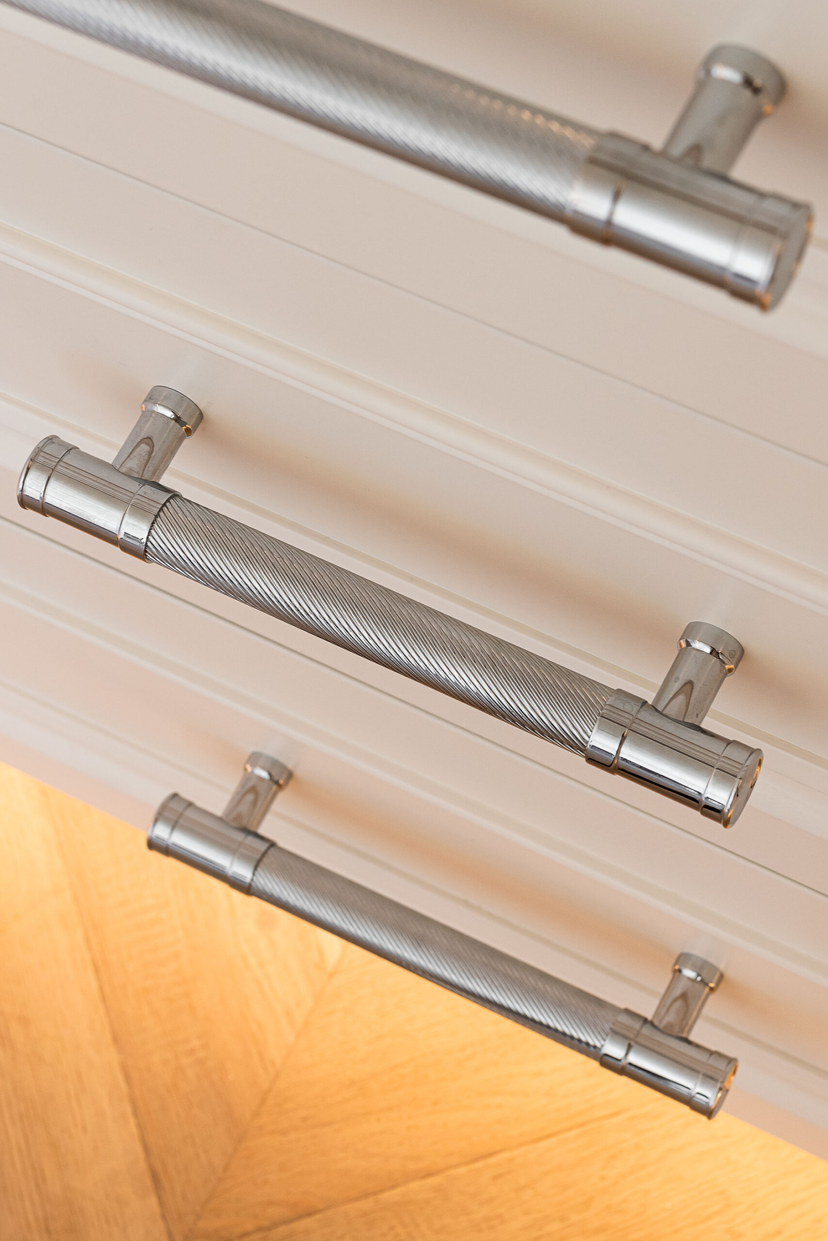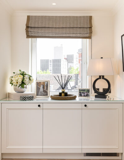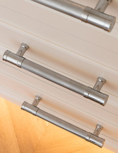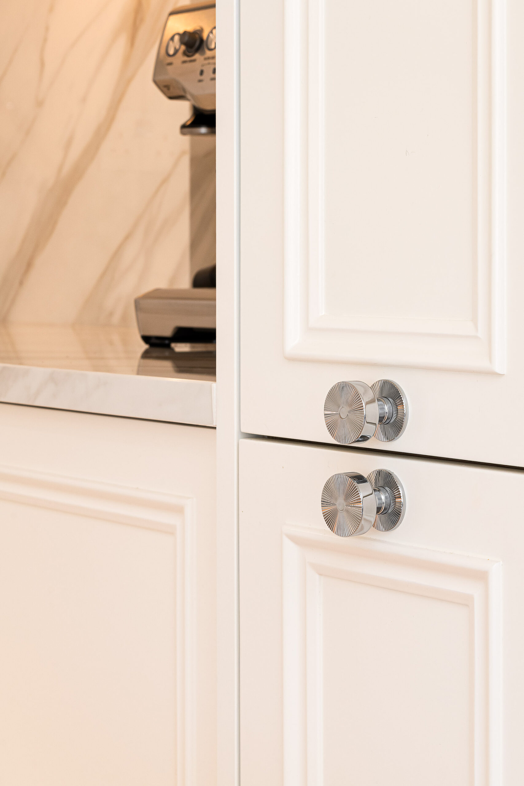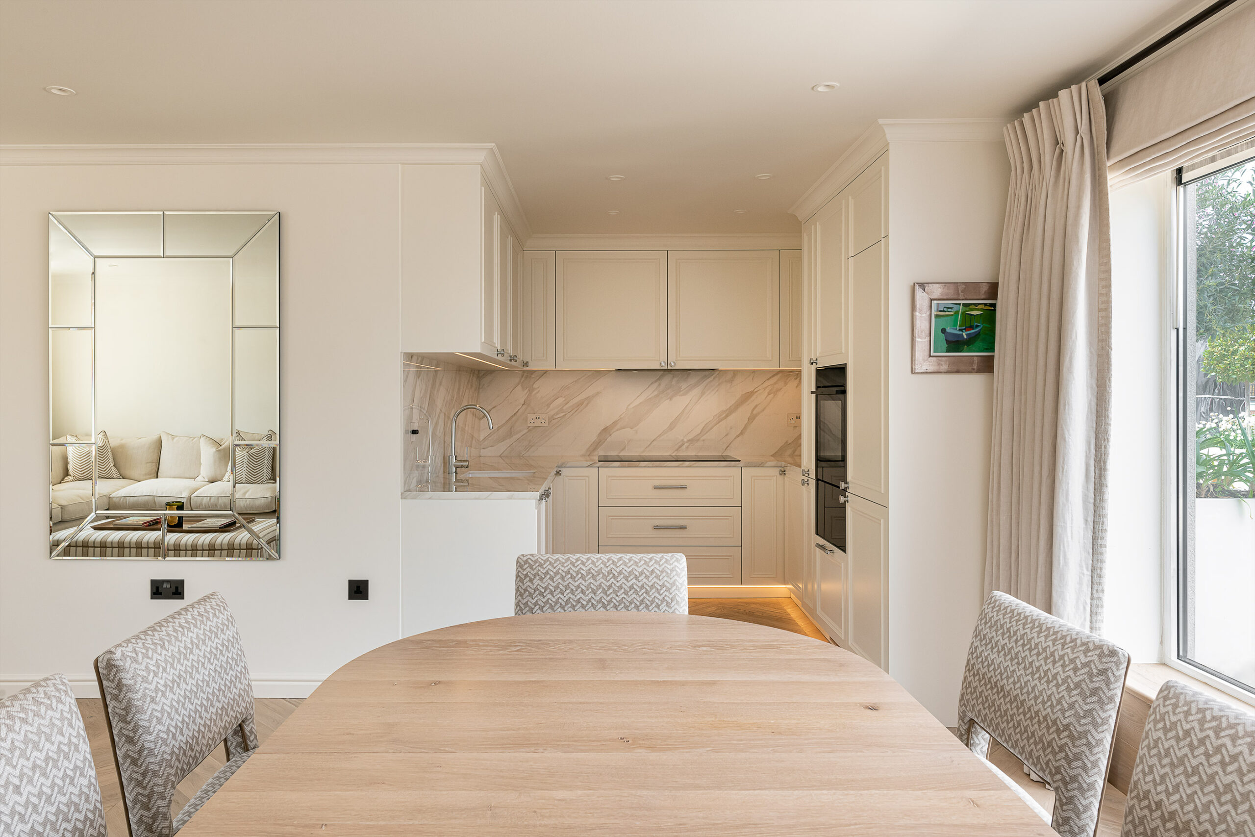 Our joinery was designed to complement the apartment’s soft neutral palette and serene atmosphere. The bespoke kitchen features classic panelled cabinetry finished in a warm ivory tone, paired with a delicate marble-effect worktop and backsplash that add depth and elegance. Each detail — from the precision-cut mouldings to the brushed nickel handles — was meticulously crafted to achieve both beauty and durability.