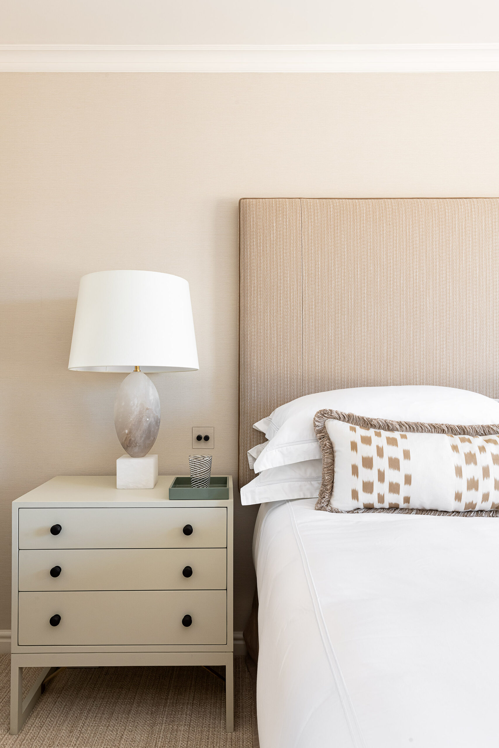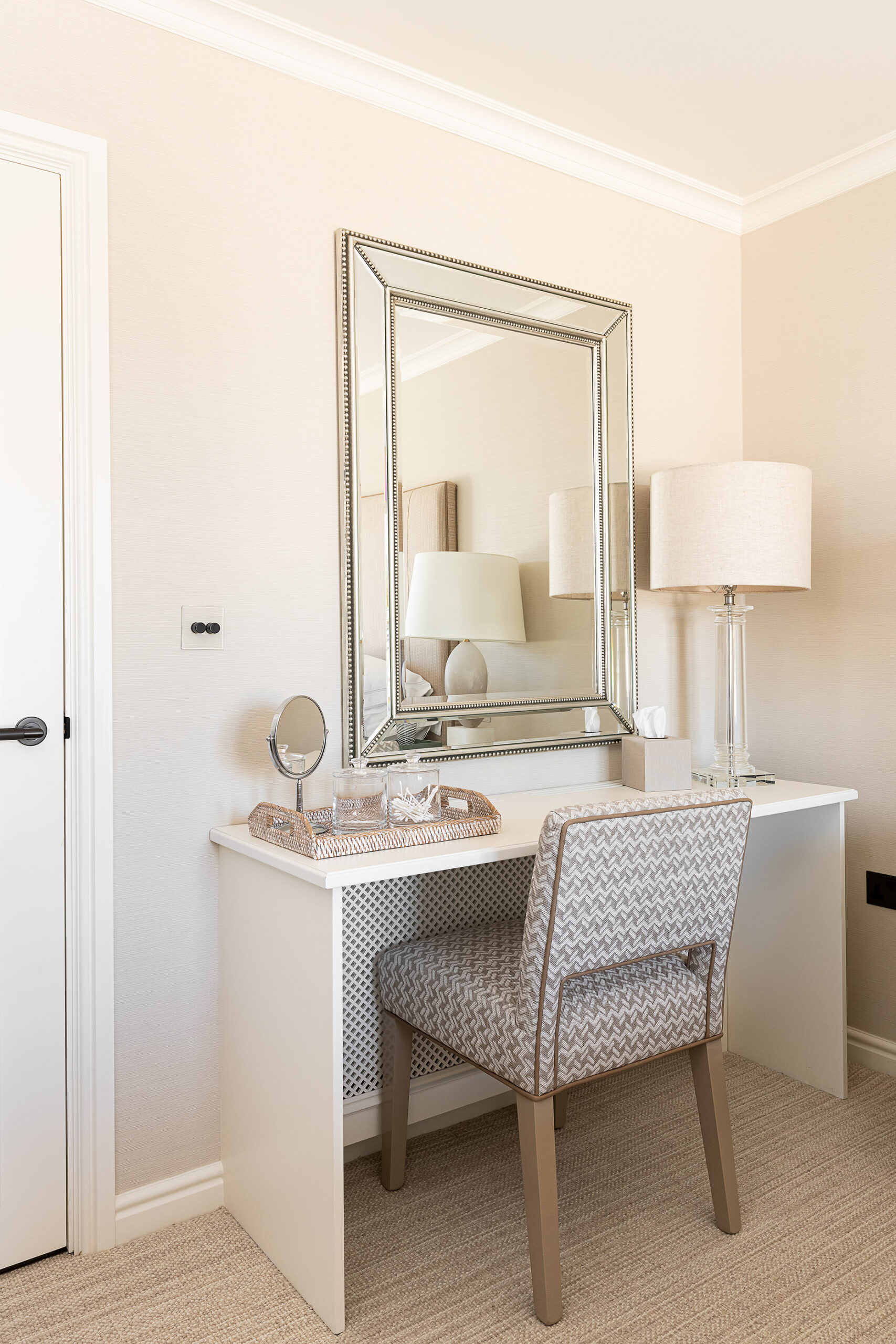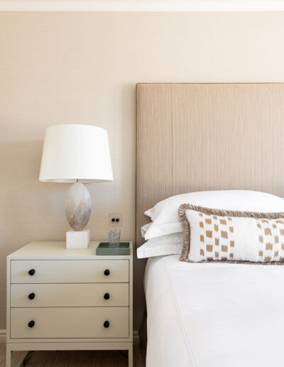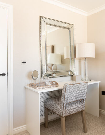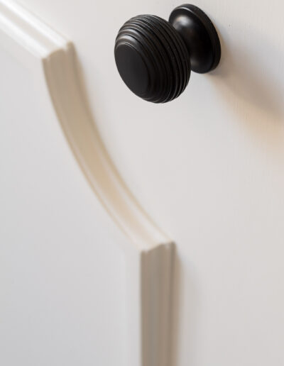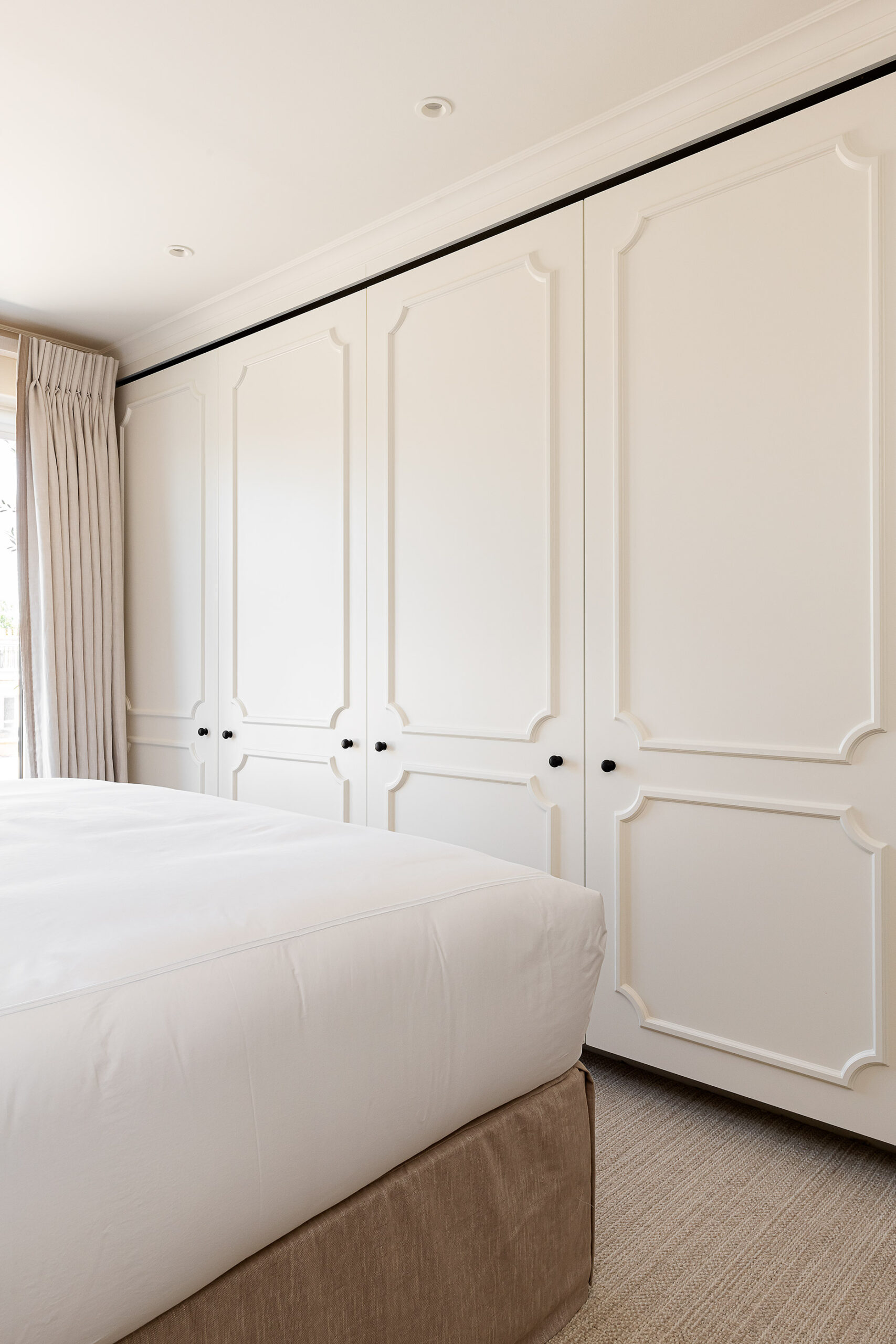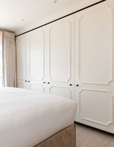 In the bedroom, custom wardrobes with decorative panelling bring a sense of balance and sophistication. Their timeless design enhances the space, offering both refined aesthetics and practical storage solutions.